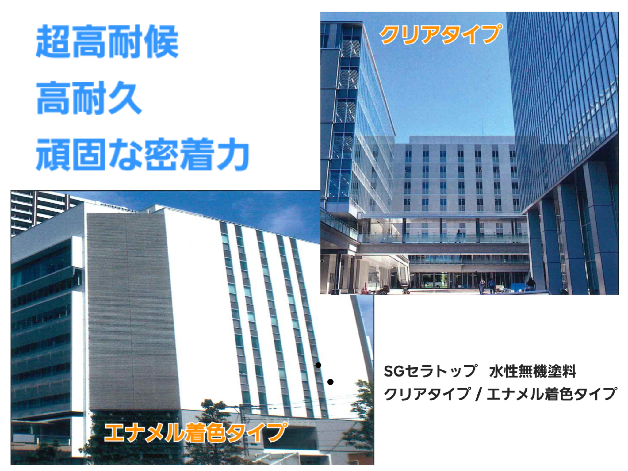 打ち放しコンクリート面の保護・長期美装に最適な「SG打ち放しコート」、耐候性に優れた最高級のふっ素樹脂塗料の「SGクリアコート」、
